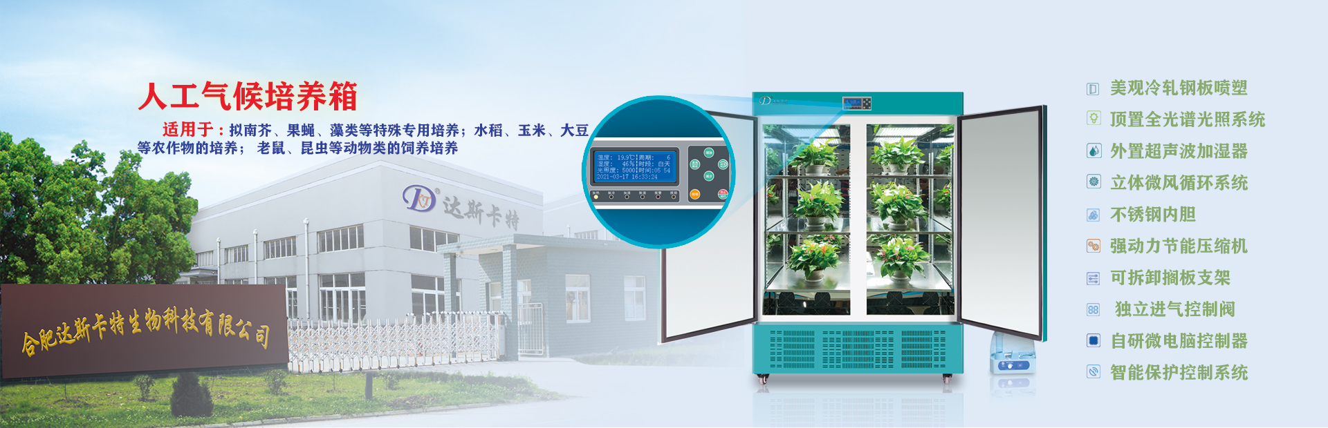 合肥達斯卡特生物科技有限公司前身是合肥華德利科學器材有限公司,擁有自足品牌“達斯卡特”。本公司是專業(yè)研發(fā)、生產制造、技術服務及市場營銷為一體的實業(yè)公司。公司自主研發(fā)的各類規(guī)格的干燥箱系列、恒溫箱系列、生化培養(yǎng)箱系列、光照培養(yǎng)箱系列、人工氣候箱系列、恒溫恒濕箱系列、二氧化碳人工氣候箱系列、低溫培養(yǎng)箱系列、超低溫保存箱系列、搖床系列、人工氣候室、植物生長室、冷庫、潔凈室等實驗室儀器設備及工程項目,特別是實驗室箱體類的產品目前擁有二十八大類、五十多個品種、八十多個規(guī)格、近三百多個型號。